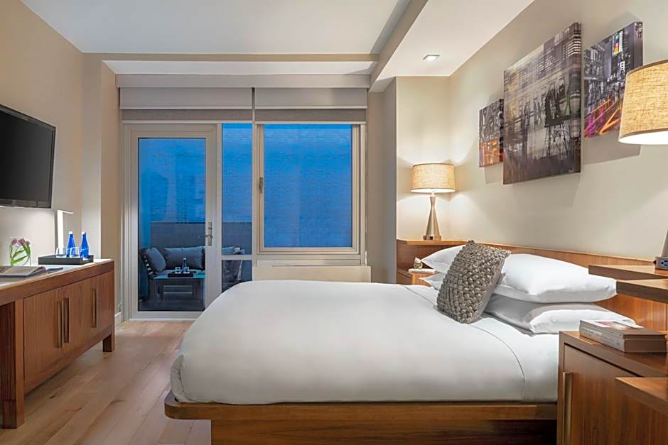 Located on floors 17-18 overseeing 46th Street with loft-like ceilings and dynamic windows. Features a large private terrace and one Queen bed with 400 thread count cotton linens.